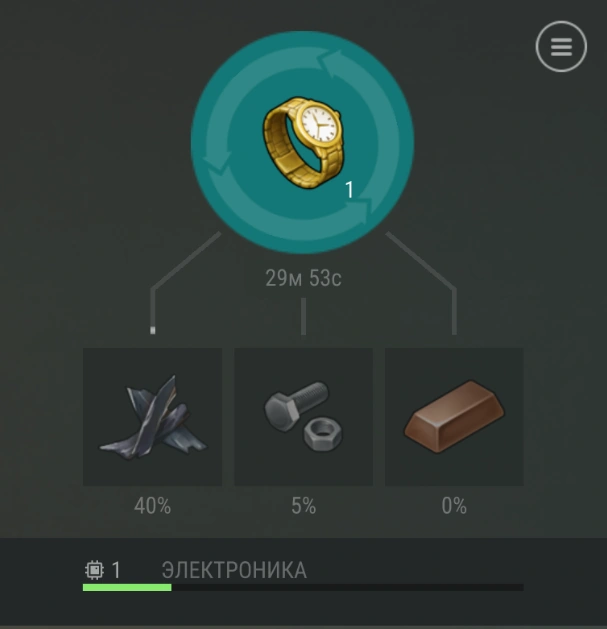 Чтобы разобрать предмет, нужно положить его в ячейку чуть выше центра экрана, после чего запустится сам процесс. В 4-х ячейках ниже будут указаны ресурсы, которые можно получить, и шанс их получения. Этот шанс зависит от уровня прокачки той или иной группы предметов, но об этом пойдет речь чуть позже. Также, что важно, указанный шанс не всегда является таковым, так, шанс получения, например, карбона из огнестрельного оружия зависит также и от прочности этого оружия.