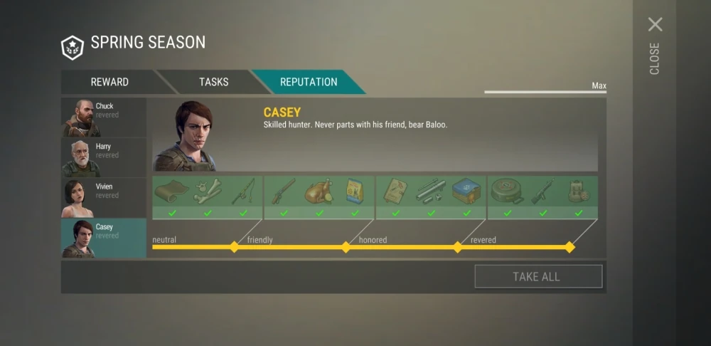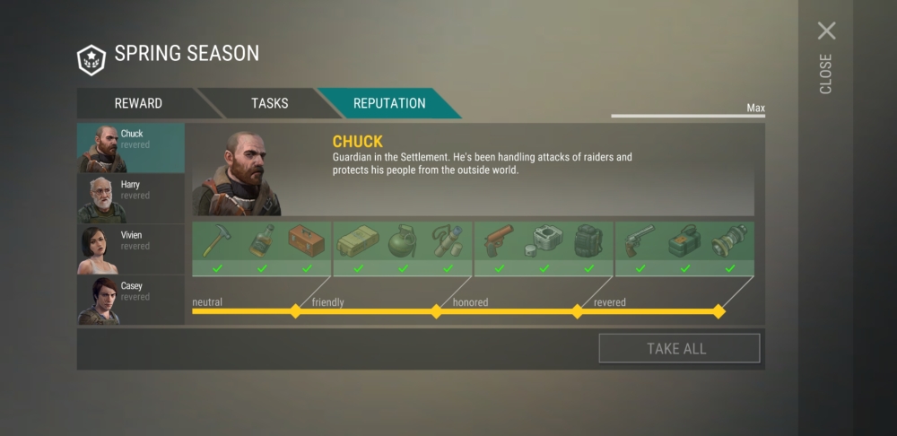 The main topic of Season 6 is helping survivors in the Settlement. Chuck and Harry are available since Week 1, Vivien from the start of Week 2 and Casey only from Week 3. The reward for completing their tasks and bringing the required resources is an increased reputation bar which in turn unlocks accumulative rewards in the Season Reputation tab.